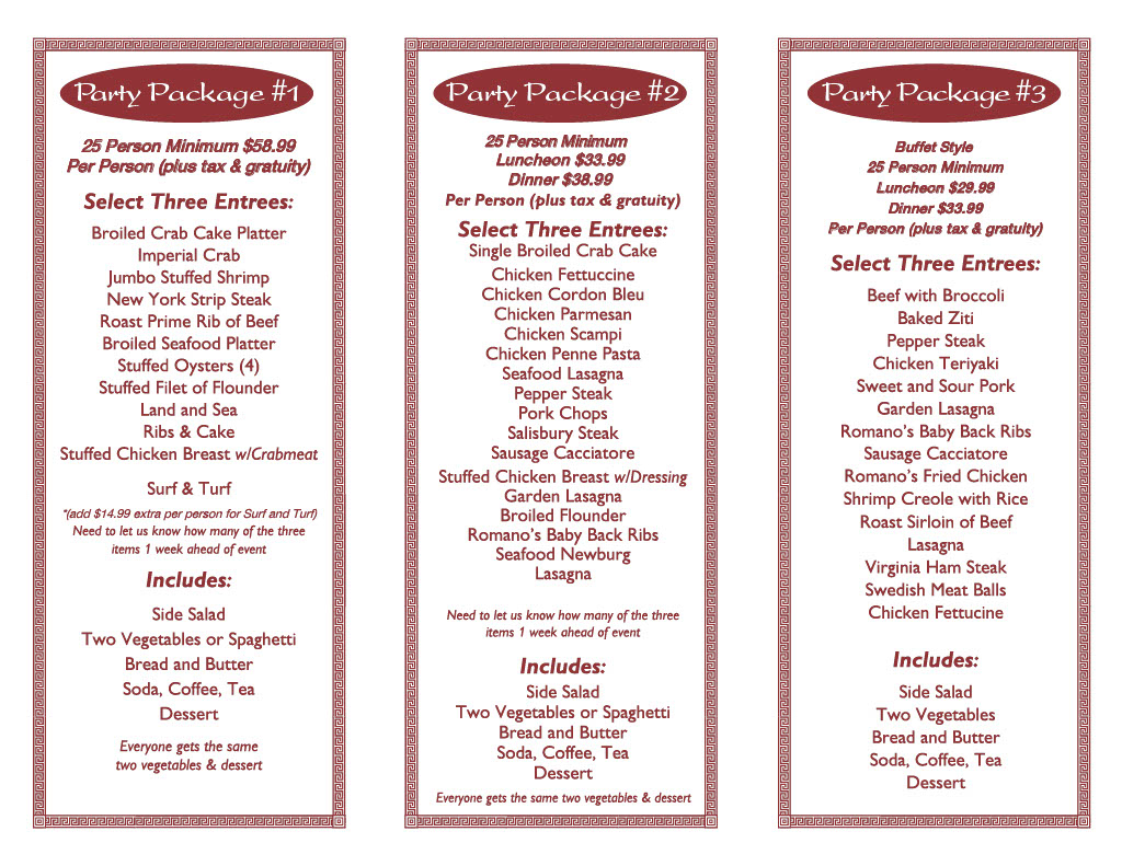 *Final count of guests, food choices and vegetables must be given within three days of the scheduled party and is the number you will be charged for. Reservations are requested two weeks in advance.